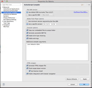 Ahora en esta ventana deben de dar clic «Actionscript compiler» y luego en la seccion «compiler options» deben escribir lo siguiente: